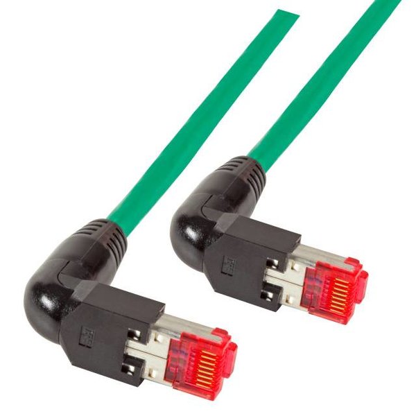 10 Gigabit Ethernet Cat.6A 500 MHz Patchkabel, 90° gewinkelt. 2 x Hirose TM21 RJ45 Stecker, geschirmt, IEC 60603-7-5. Draka UC900 1000MHz S/FTP 4 x 2 x AWG27/7 PiMF LSZH Ø=5.9 mm. Belegung nach TIA/EIA 568B. Flammwidrig IEC 60332-1, halogenfrei IEC 60754-2, raucharm IEC 61034. Montierte Knickschutztülle mit Klinkenschutz, 90° gewinkelt. Klasse EA Link-zertifiziert durch GHMT. Andere Kombinationen auf Anfrage möglich.. Kategorie: 6A (TIA) Kabeltyp: S/FTP Steckverbindertyp Anschluss 1: RJ45 8(8) Steckverbindertyp Anschluss 2: RJ45 8(8) Mantel-Farbe: grün Knickschutztülle: aufgesteckt Rasthebelschutz: Ja Farbe der Knickschutztülle: schwarz Ausführung flammwidrig: Ja Halogenfrei: Ja Ölbeständig nach EN 60811-2-1: Nein Kabelkonstruktion: 4x2 NVP-Wert: - % Pinbelegung: 1:1 AWG-Querschnitt: 27
